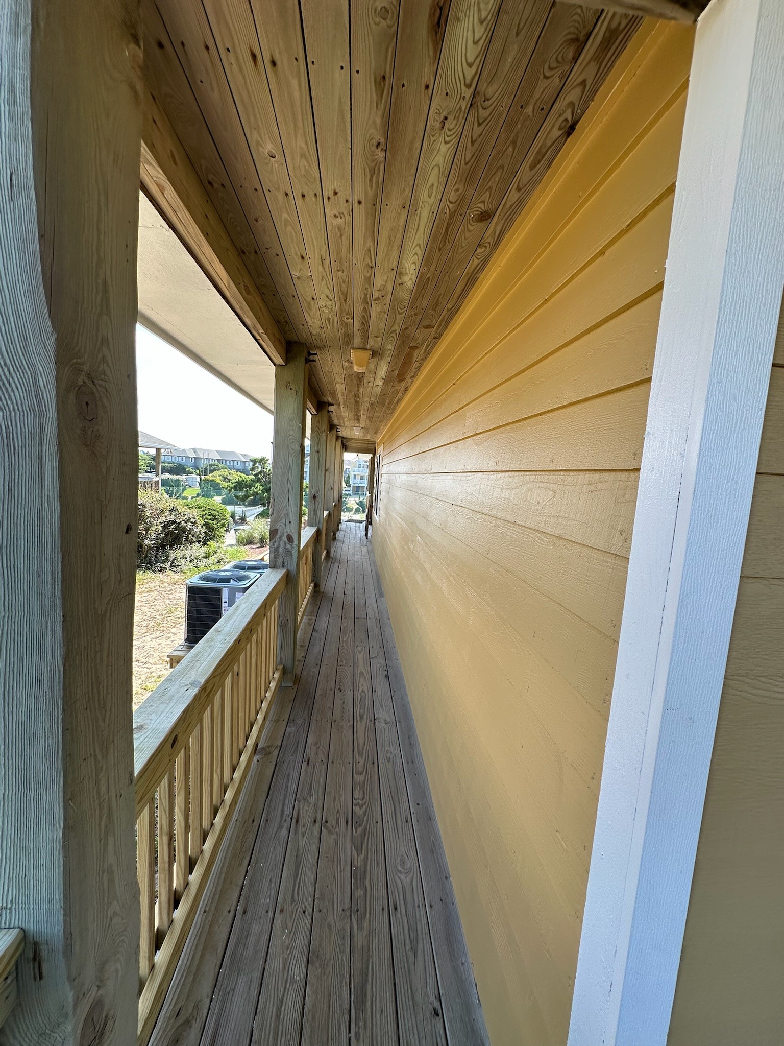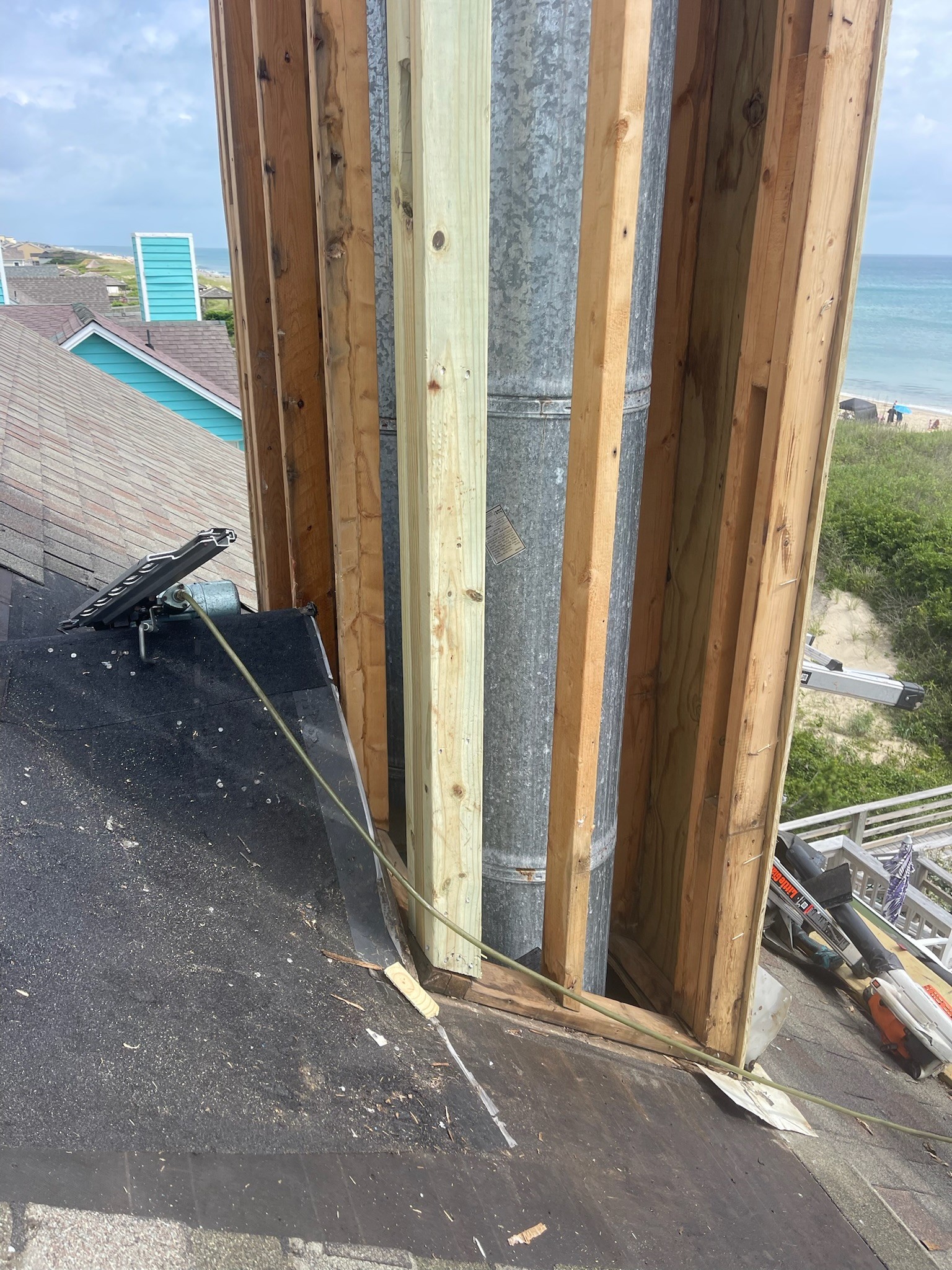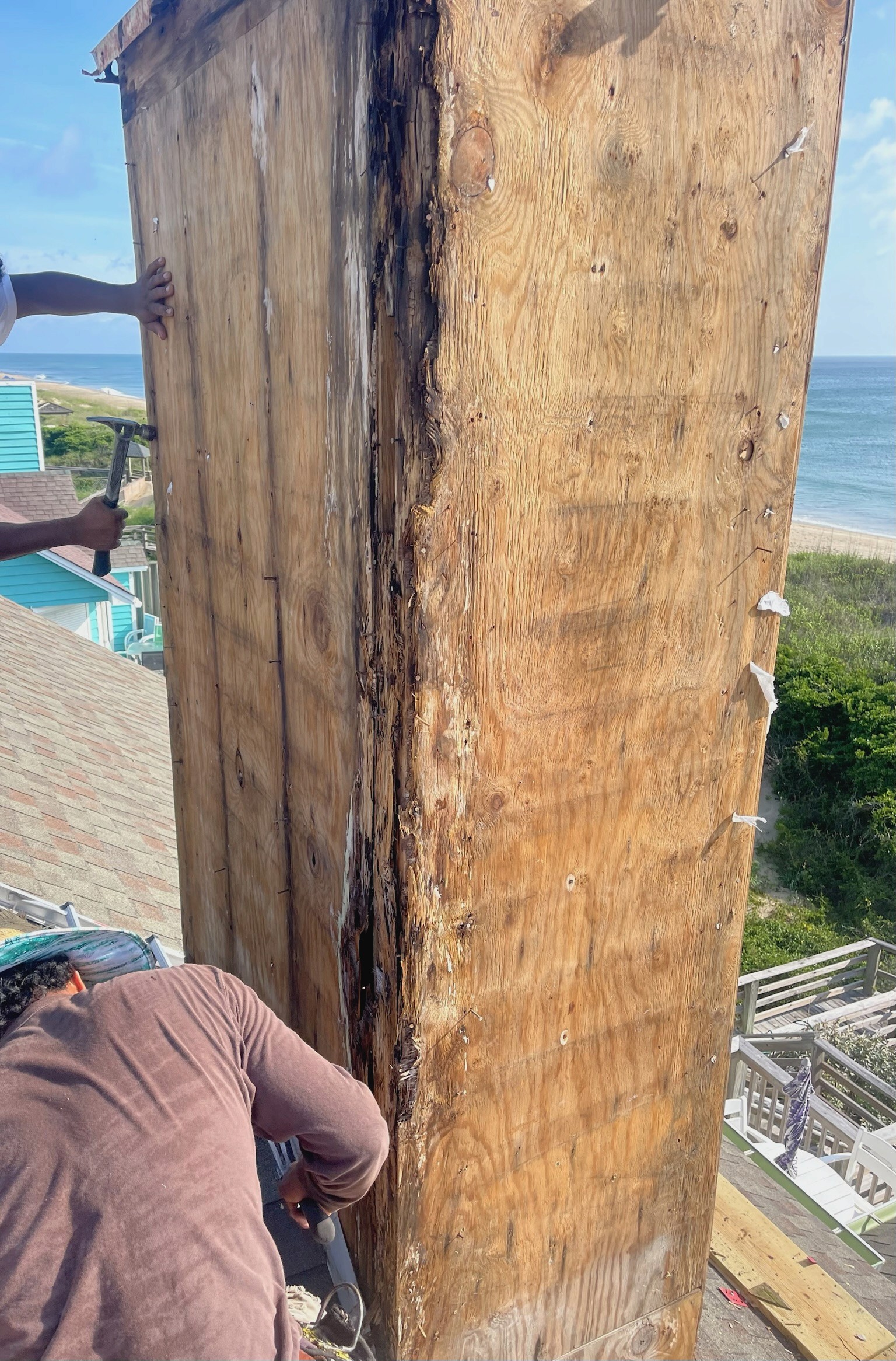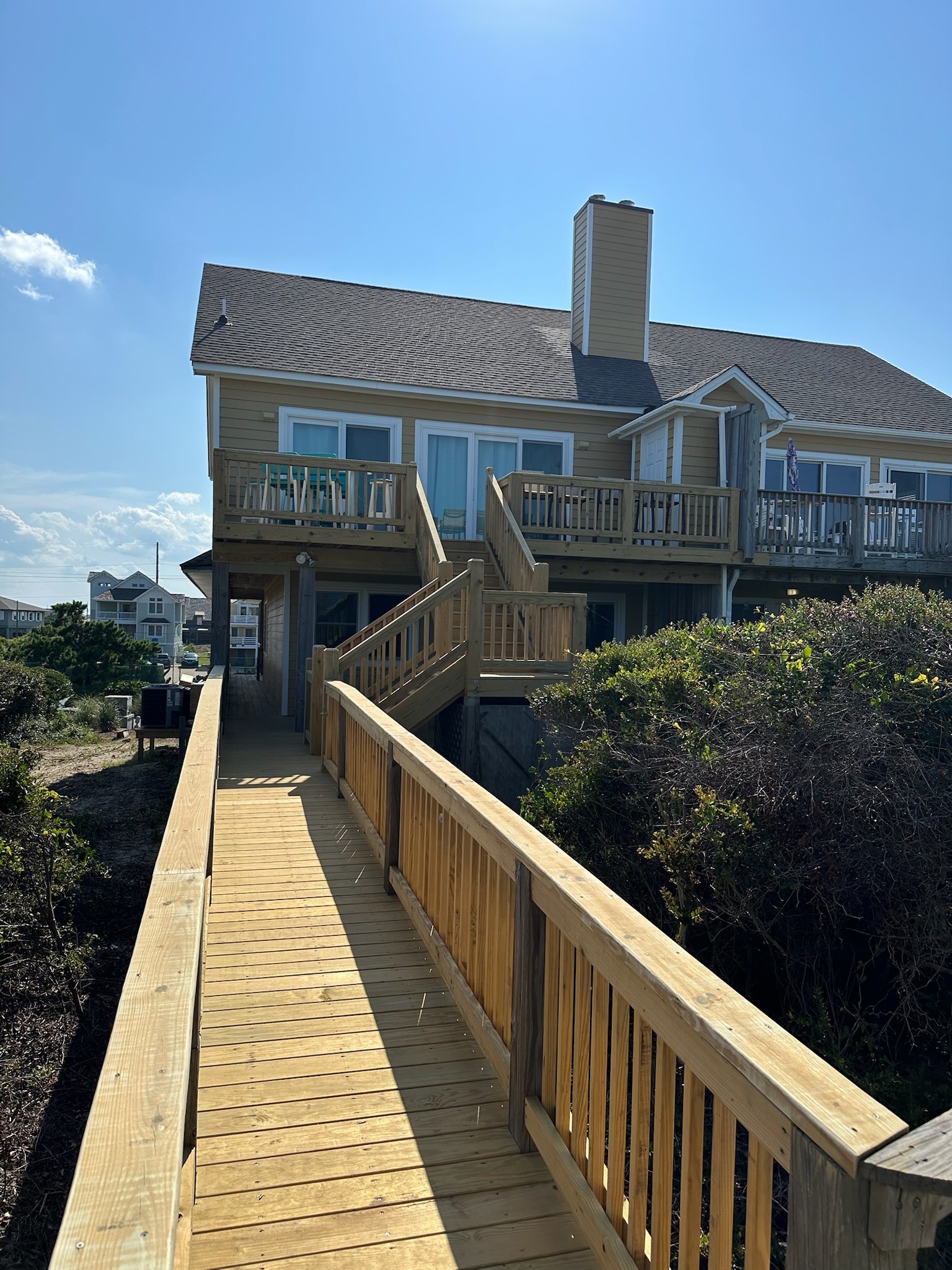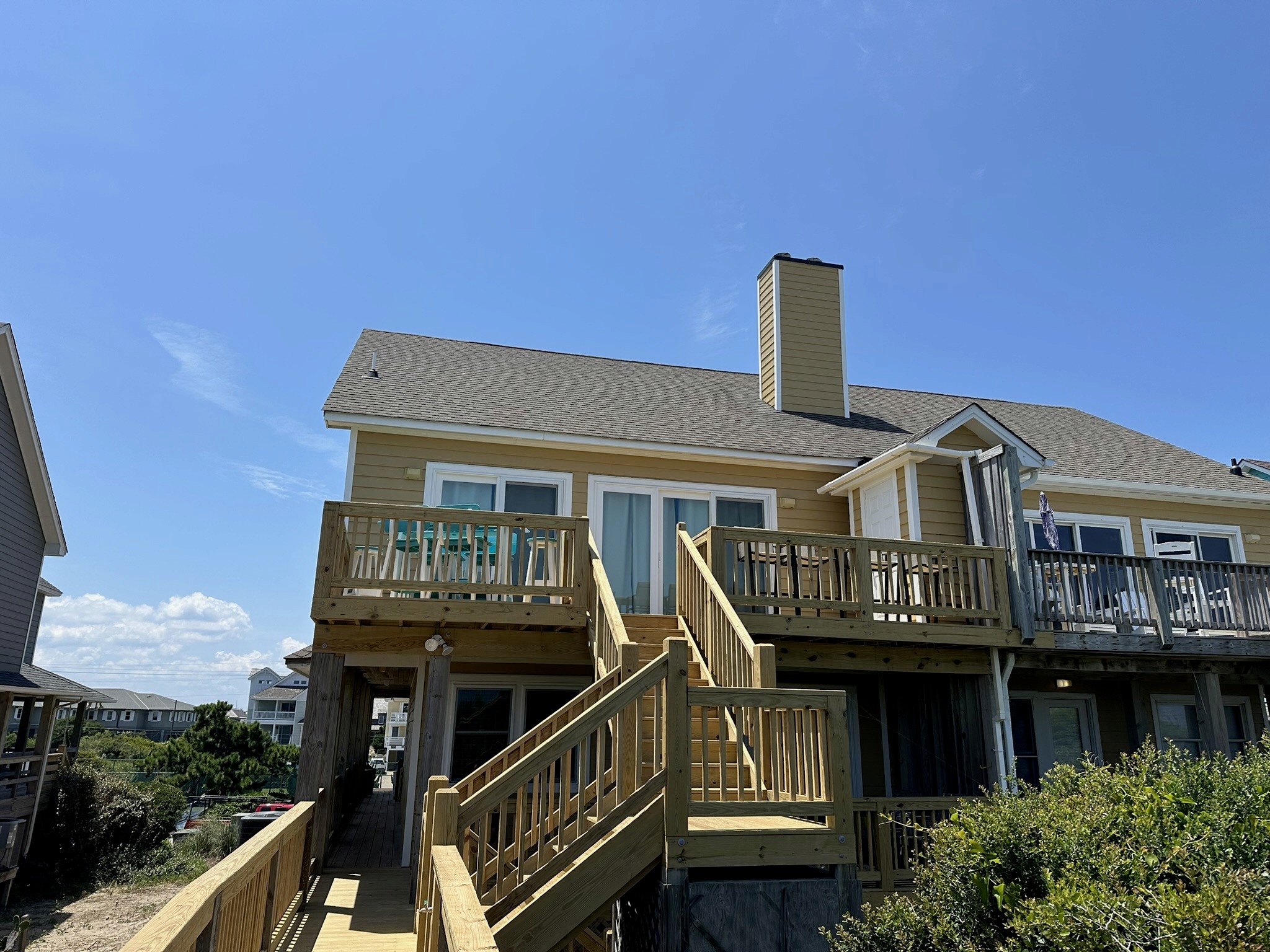 This Outer Banks coastal renovation features new oceanfront decks, expansive sliding glass doors, and durable wooden walkways leading directly to the beach. The spacious decks provide plenty of room for outdoor dining and relaxation, while the beach access stairs and railings were rebuilt with long-lasting materials to withstand the coastal climate. In addition, the chimney was fully recovered, improving both durability and aesthetics against the elements. Designed for both beauty and function, this project blends coastal charm with strength—perfect for enjoying endless ocean views.
